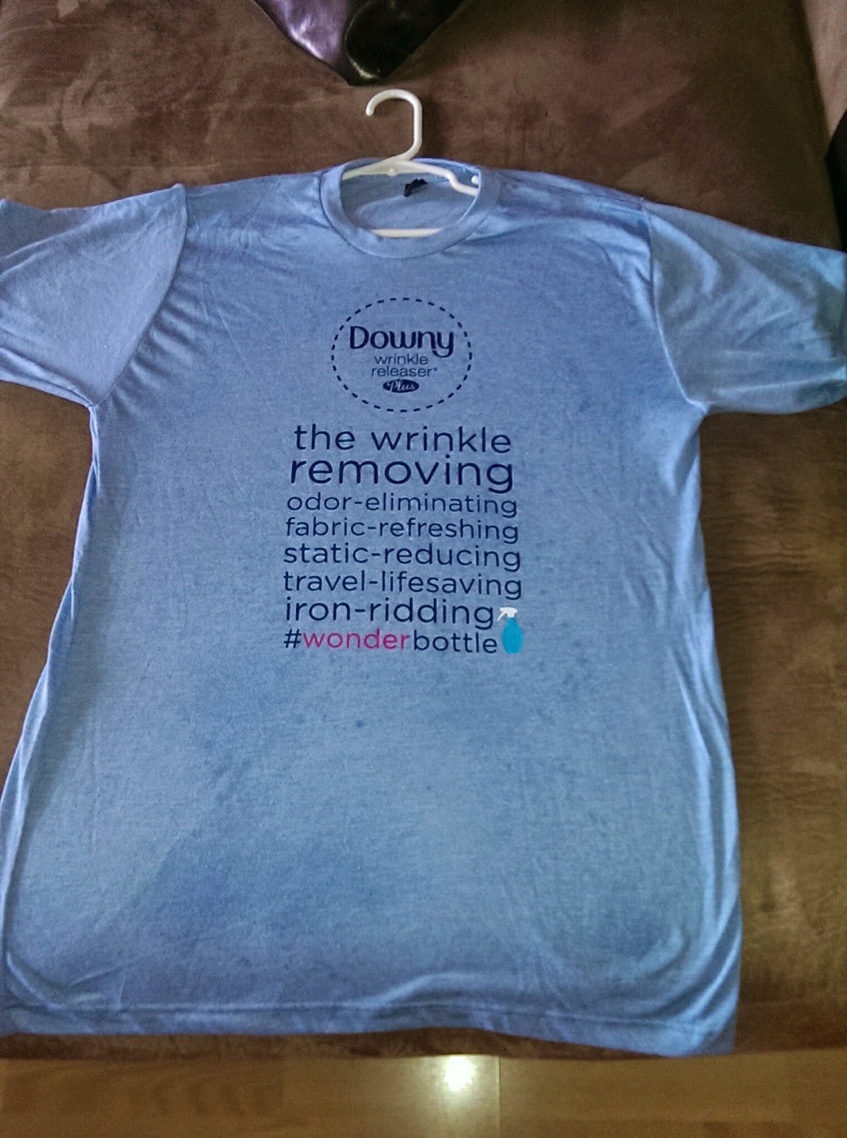 I noticed there was a wrinkled shirt in the box I received. I took it out and placed it on my couch and took a picture of it. Okay….was this stuff really going to work? I sprayed the shirt with the Downy Wrinkle Releaser Plus, smoothed it out a bit, then I hung it on a hanger, so I could watch it. The directions did not say to do so, but I was excited.