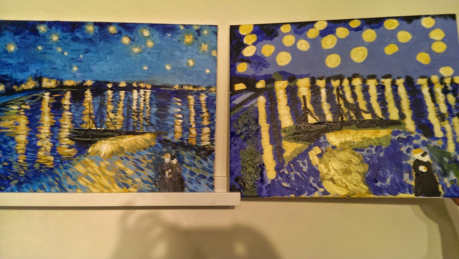 It seemed that we all could not wait to get to use the black paint. When the time came, we were applauding, but quickly learned using black paint is hard. Needless to say, our paintings turned out nice. There were different variations of Starry Night over the Rhone, but in our eyes it looked just like the original. Our proud instructor had us go to the lobby and take a group photo. I just loved this part.