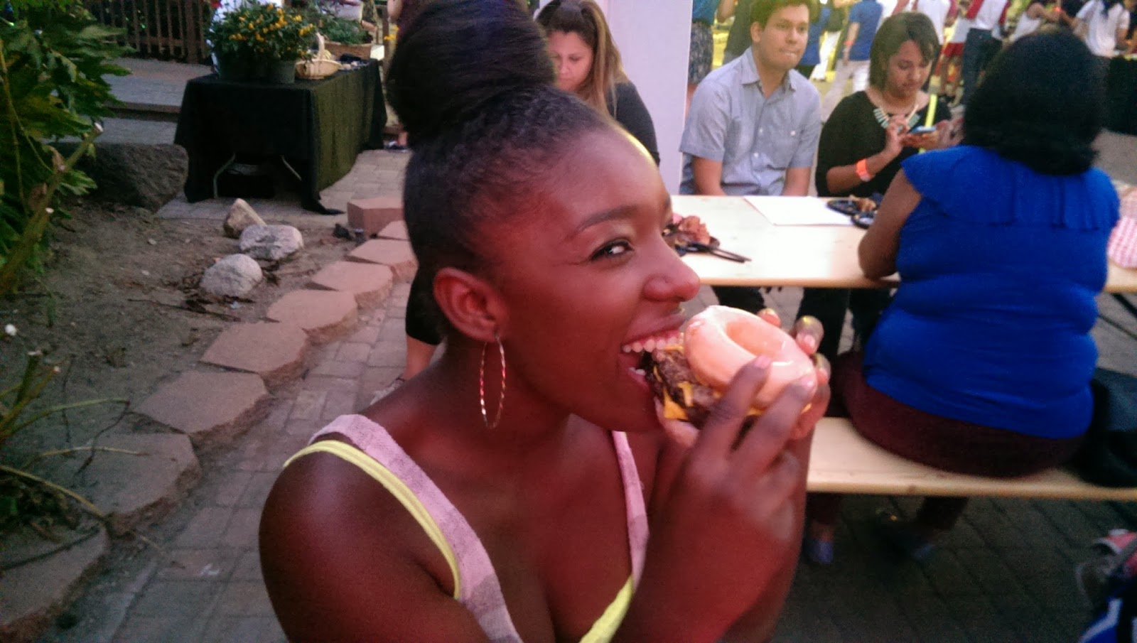 We all know, food at the LACF is always amazing!!! Ari could not resist eating the Chicken Charlies Krispy Kreme burger. She had been thinking about eating this since last year. Last year she did not have one, because she was a vegetarian. As you can see things have changed. She says, “This is a manly burger.”